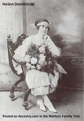 Photos of Dorothy posted on Ancestry.com by CJesinkey Elsie was 75 years old when she died in Brooklyn on July 16, 1973. She was buried in Holy Cross Cemetery in Brooklyn. When 83-year-old Leo died on April 28, 1981, he was buried with Elsie. ![]() 5. HELEN DEMBINSKI Maggie and Alexander's fifth child was Helen Dembinski, born in Brooklyn on April 14, 1901. She married George Mattern on December 14, 1922 at City Hall in Brooklyn. George was born in Manhattan on August 18, 1892. His parents were Jacob Mattern and Janet Scobie. He worked for a printing company. George was a short 5' 3" tall, weighing about 130 pounds, with blue eyes, black hair and a light complexion. He was a veteran of World War I, serving as a cook in the U. S. Navy.